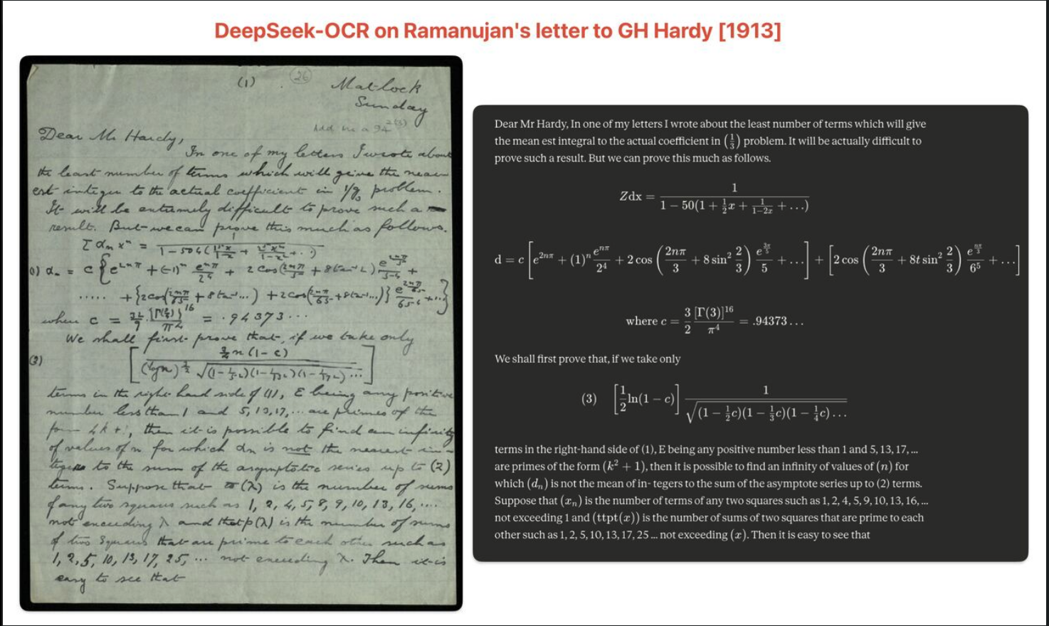 For sure a lot more errors in this one in terms of OCR quality. On my handwriting the model frequently messes up what the power was of variables, exact forms of equations, confuses vectors, and more. Given this performance I would highly agree with the comments I have seen on social media that the letters from Ramanujan to GH Hardy were likely in the training set of the DeepSeekOCR model. Performance on my handwriting was still very strong, but clearly not to the caliber of a model that almost perfectly gets the scribbled handwriting from the Ramanujan letter.