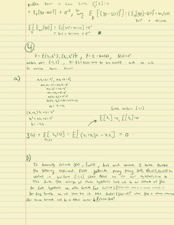 - To numerically estimate \(g(x)\), \(E_D(x)\), bias, and variance, I have devised the following estimator. First, generate many training sets \(g(x_1, x_2)\) for values in uniform \([-1,1]\) space. Next we fit our hypothesis line to this data. The average of these hypothesis lines will be our estimate of \(g(x)\).